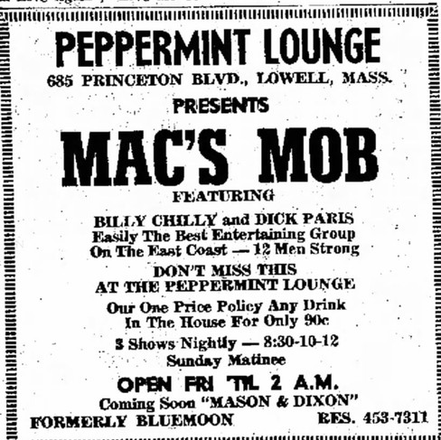 A concert poster for the Peppermint Lounge, and a go-go-dancer in a cage